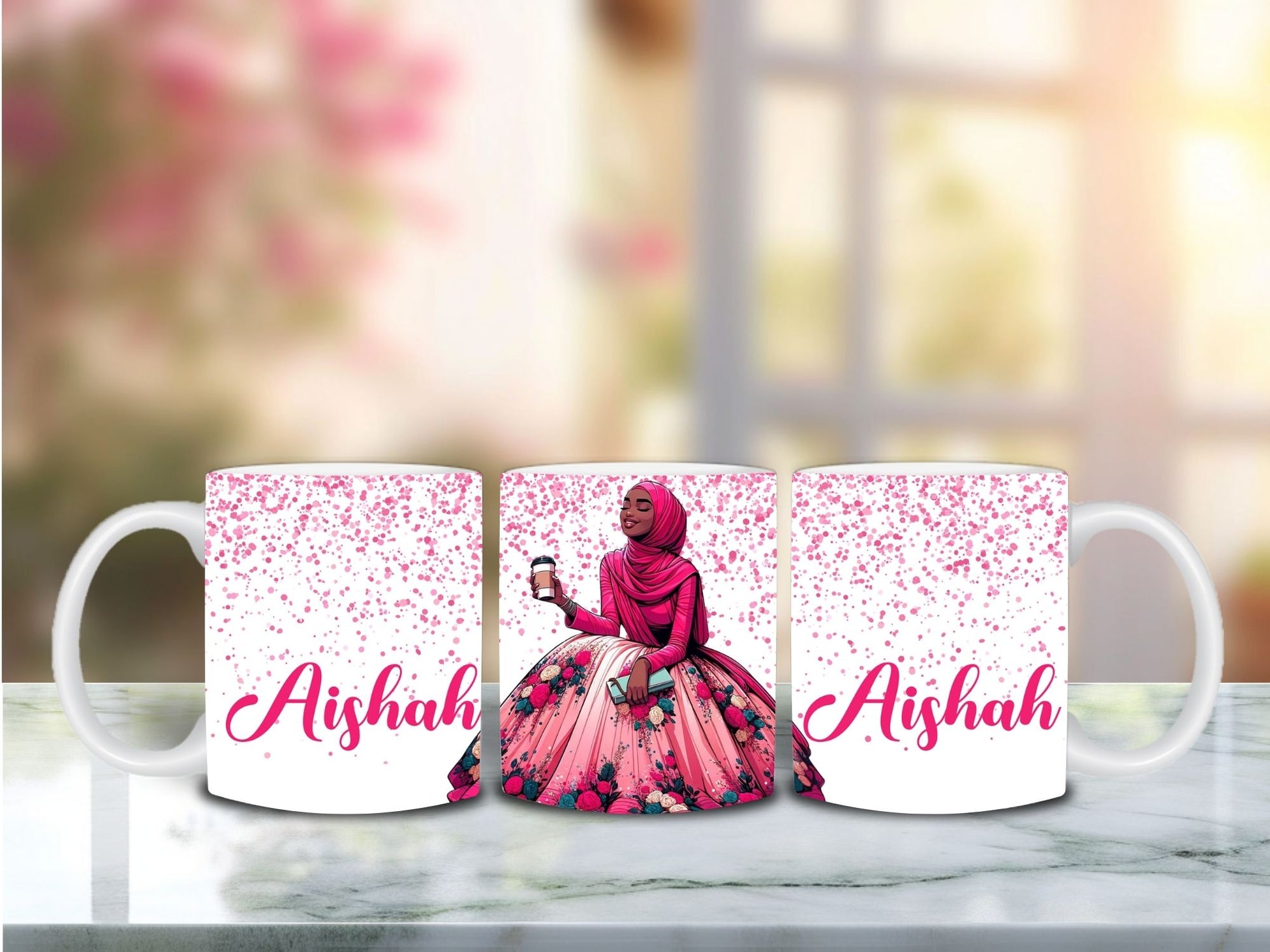 Experience the perfect blend of utility and style with our exclusive 11oz sublimated personalized mug. This beautifully crafted mug features a poised muslim woman centered on the mug. Your personalized name on both sides of the image.